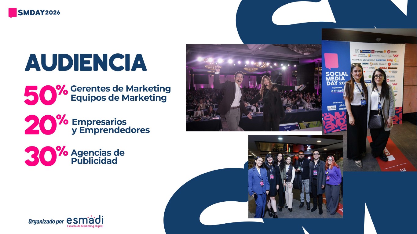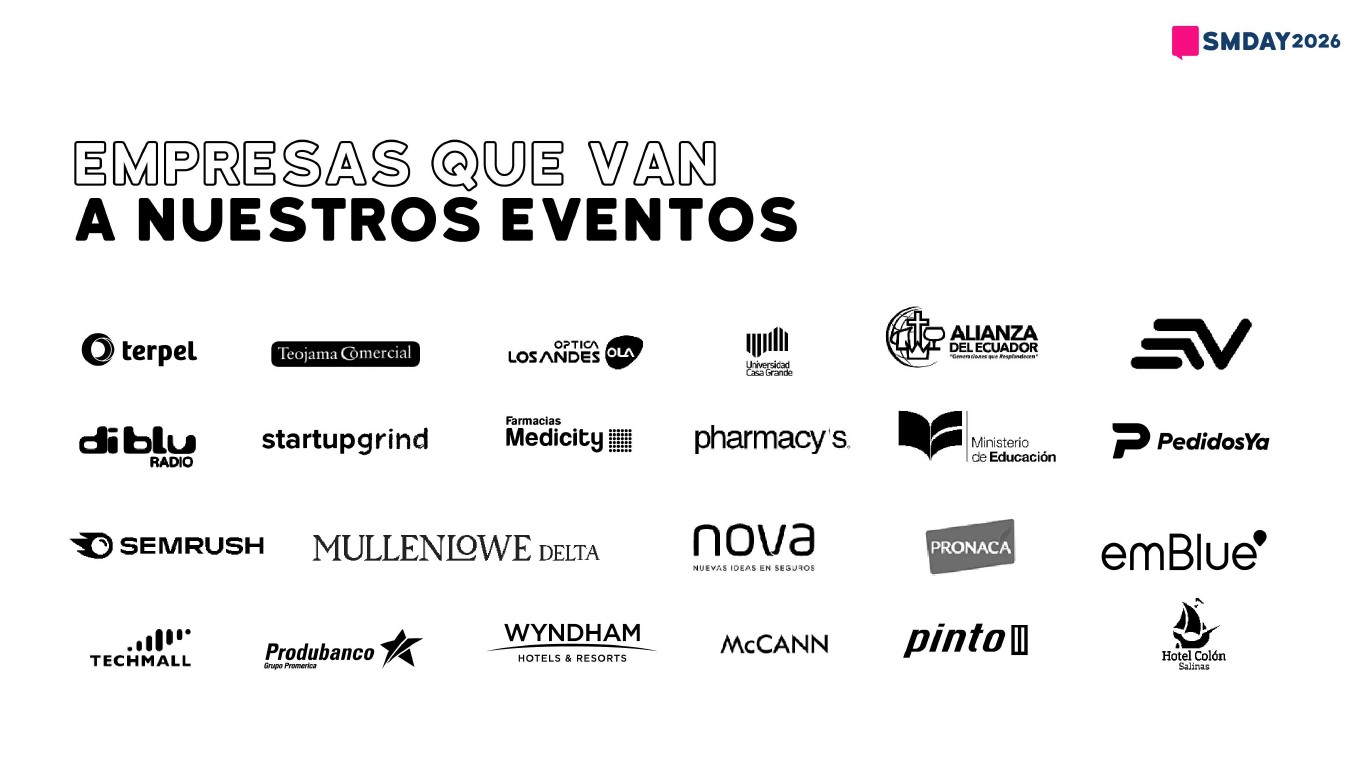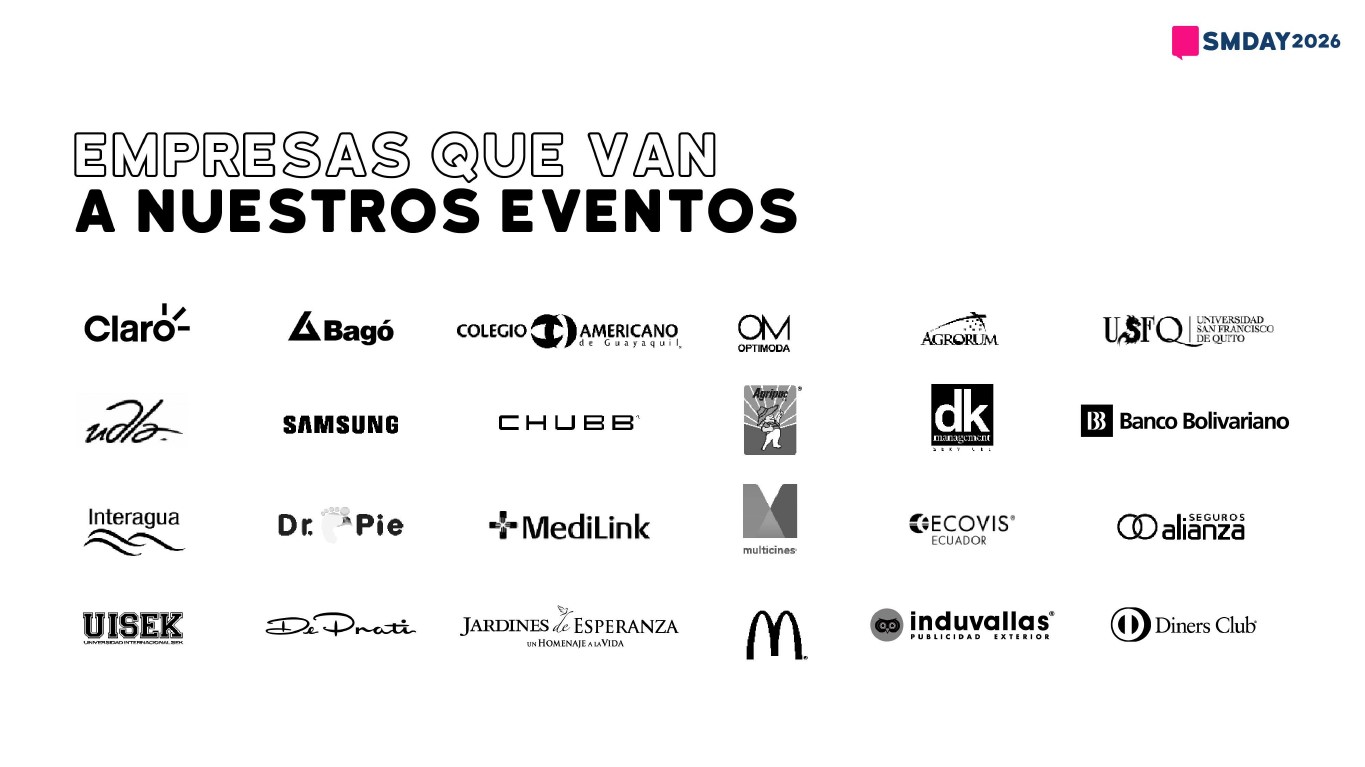 ¡El evento más destacado de Marketing Digital en todo el país! Desde el año 2016, el Social Media Day (SMDay) se ha convertido en un referente en Ecuador, contando con más de 20 ediciones exitosas.